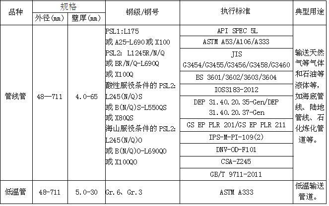 用于石油、天然氣工業中的氣、水、油輸送。公司管線管產品現已形成高強管線管、海底管線管、耐低溫管線管、耐高溫管線管、抗腐蝕管線管等多用途、高檔次產品的制造能力。強度級別高達:API 5L*100。管徑范圍:114.3~460mm。